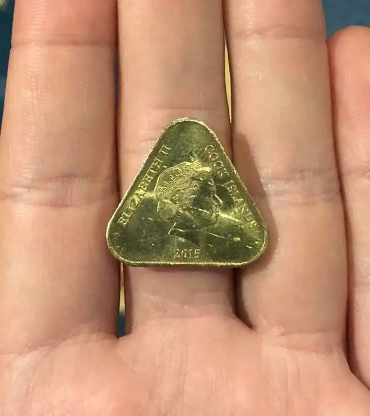 Egy háromszög alakú 2 dolláros érme a Cook-szigetekről.