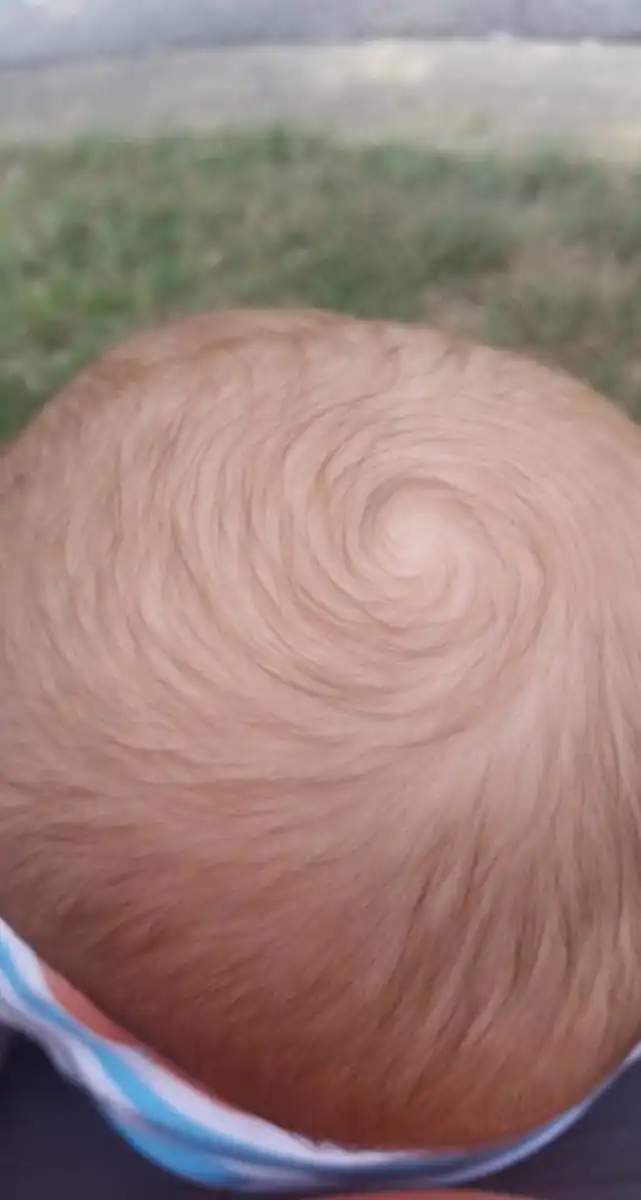 Ennek a nyolchónapos kisbabának a haja forgószélként nő a fején.